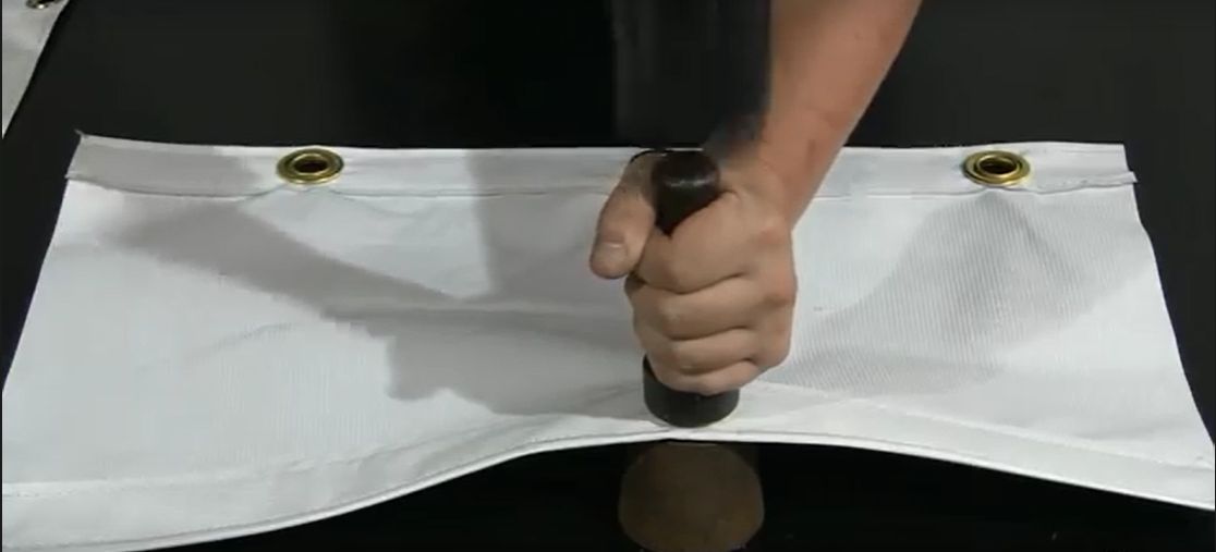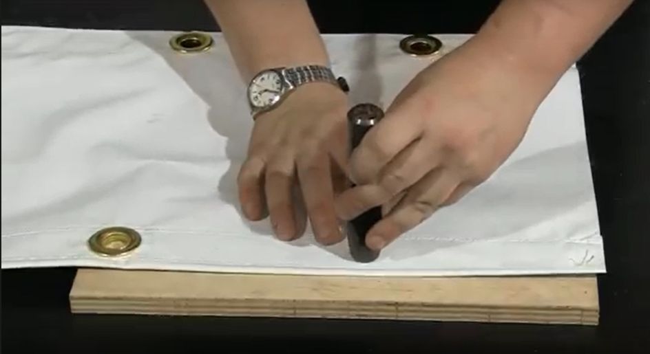 Slide the die under the canvas tarpaulin until it cups the grommet, insert the setter into the centre of the grommet shaft, and strike the setter with the mallet or hammer until the grommet shaft flattens and spreads over the washer. Thereafter the grommet/eyelet would be ready for use.