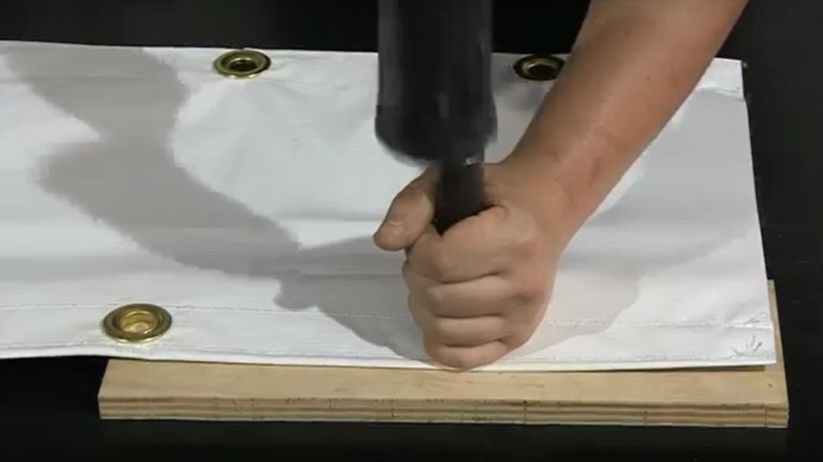 Insert the grommet/eyelet shaft through the hole of the canvas tarpaulin, and place the canvas tarpaulin on the work surface with the grommet side down. Slip the washer, rounded side up, over the grommet shaft.